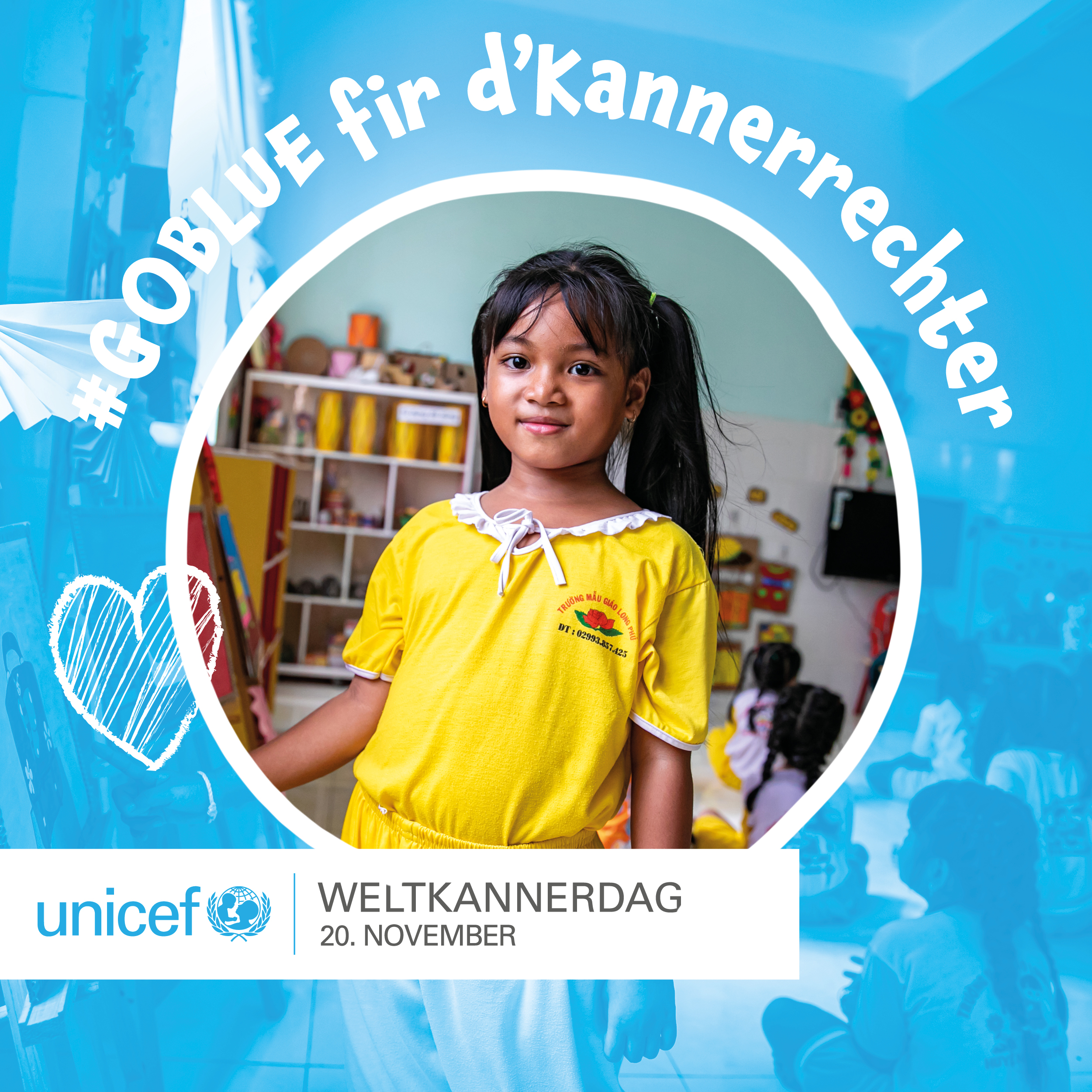 Fir de #Weltkannerdag, deen den 20. November 2023 stattfënnt, ze feieren, ënnerstëtze mir d’Campagne #GoBlue vun UNICEF Luxembourg a beliichten d’Gemengegebai blo den 20. November owes.