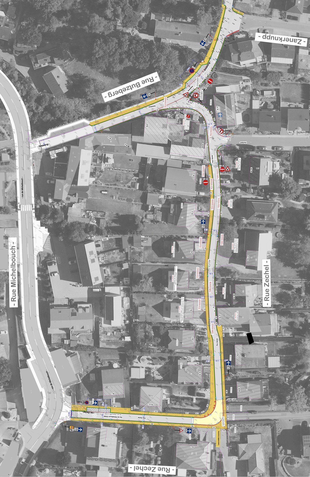 Dans le cadre du redressement de la chaussée, la Commune de Mertzig met également en œuvre des améliorations pour la circulation dans cette partie du village. En collaboration avec un bureau d’études, nous avons établi une nouvelle réglementation de circulation qui a été votée par le Conseil communal. Les rues Zechel et Butzebierg seront désormais à sens unique. Cette modification permettra d’élargir le trottoir sur ces voies, offrant ainsi une meilleure sécurité pour les piétons tout en améliorant la situation au carrefour Zechel/Butzebierg.