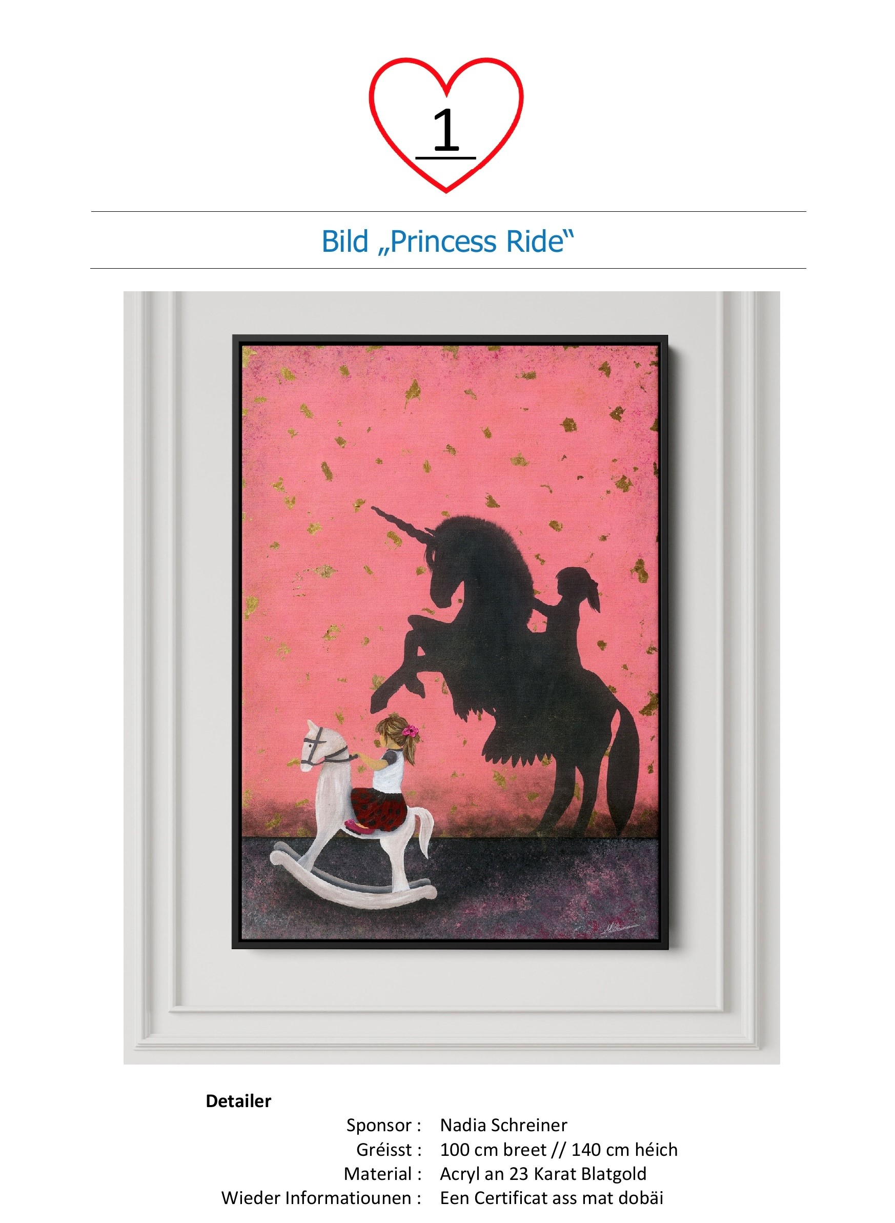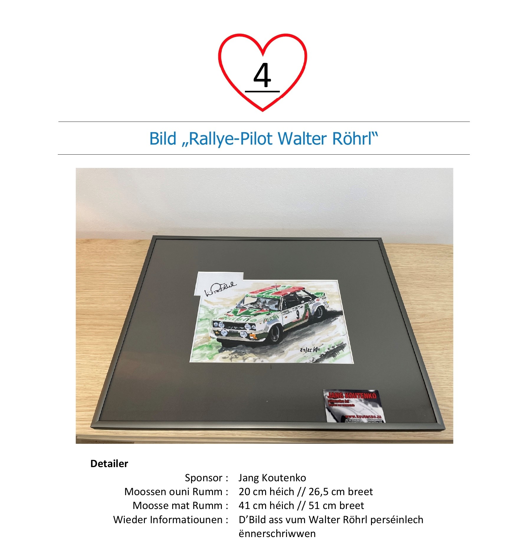 Si vous êtes le meilleur enchérisseur, on va vous contacter et l’objet peut être retiré le 7 mai dès que l’argent a été viré sur le compte du centre de promesses Mertzig CCRA LU60 0099 7814 7024 0431.