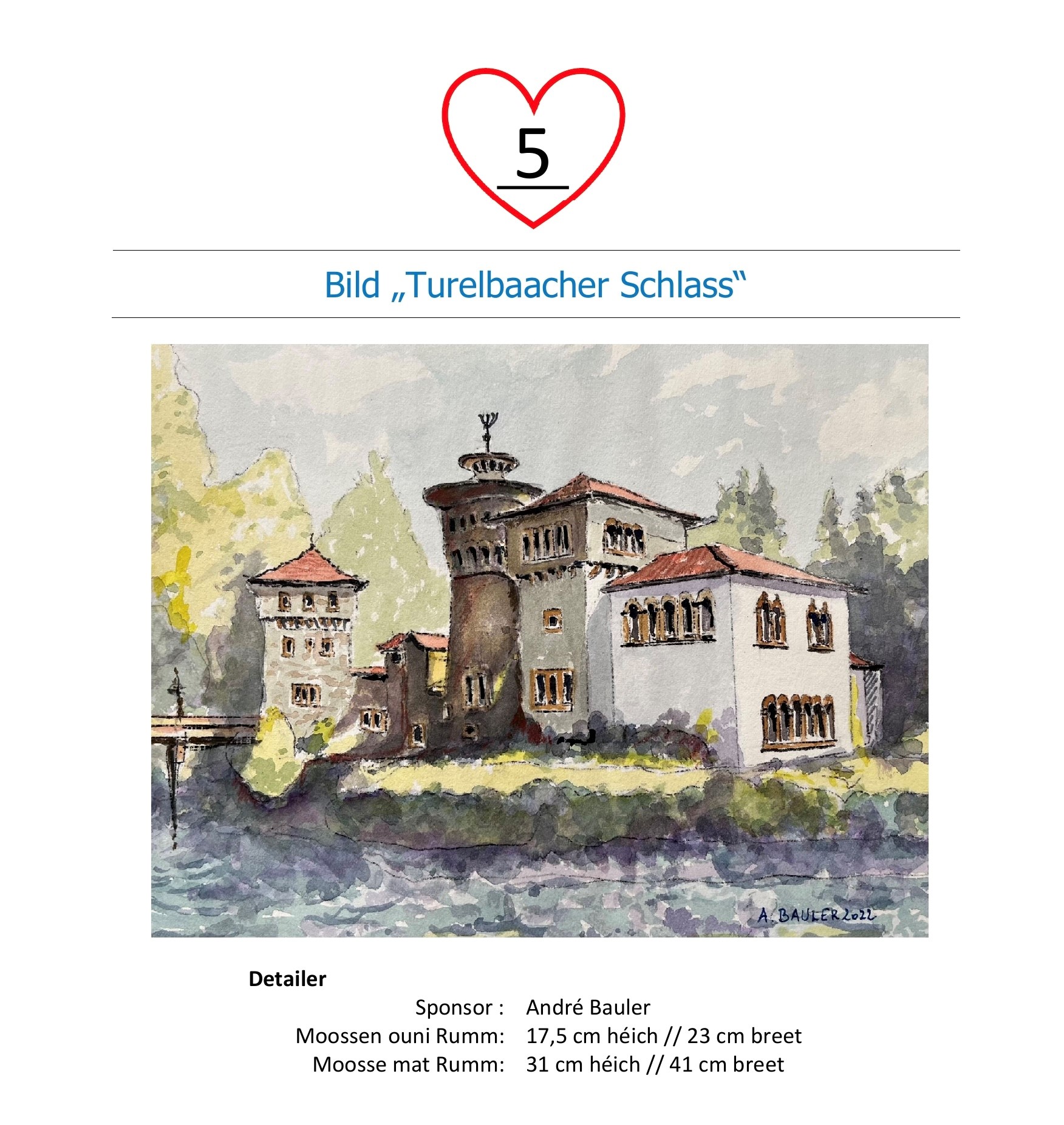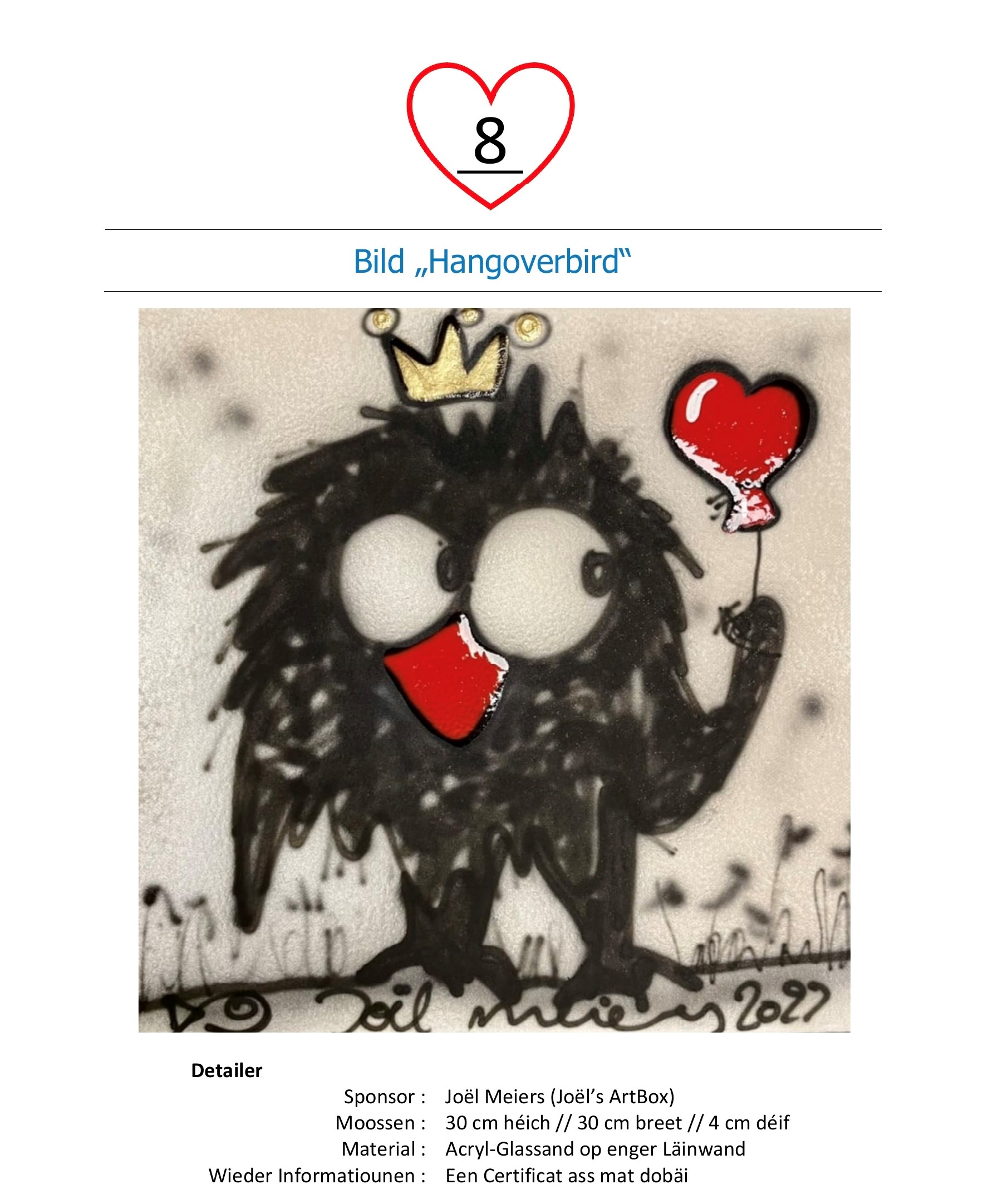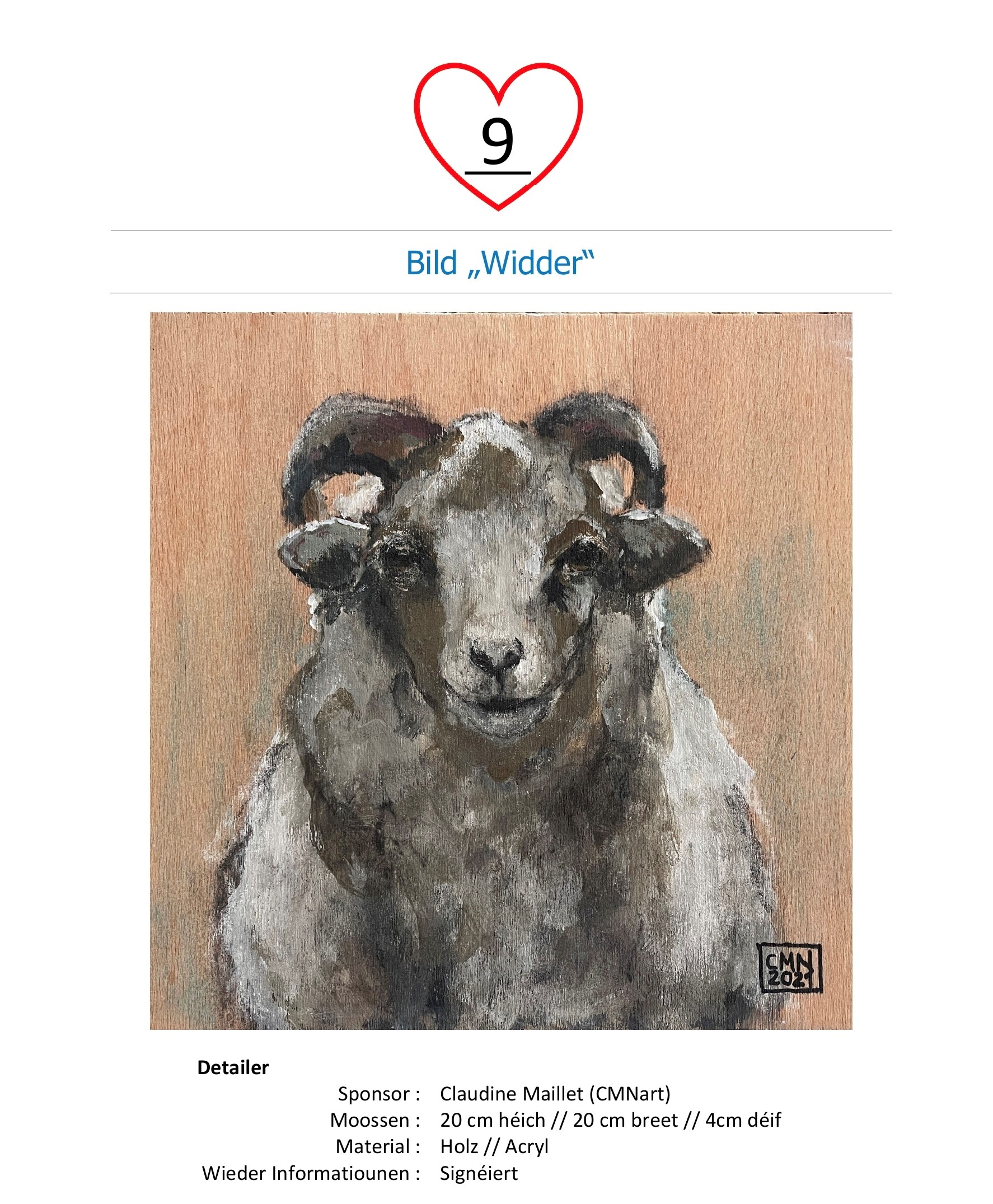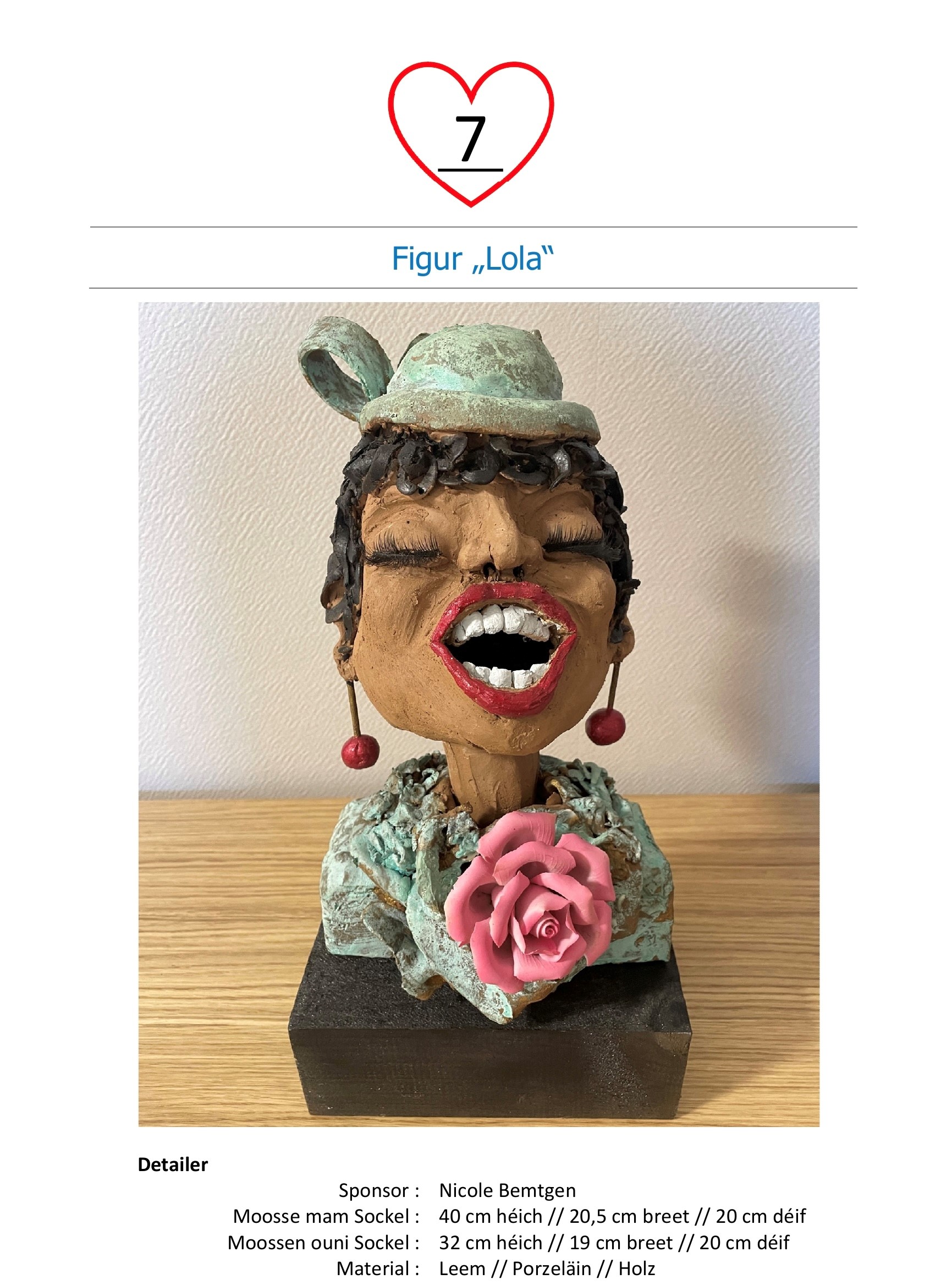 Wann Dir den Héchstbiddende sidd, da gitt Dir vun eis kontaktéiert a kënnt dann, nodeems Dir de Montant op de Kont vum Centre de promesses Mäerzeg CCRA LU60 0099 7814 7024 0431 iwwerwisen hutt, den Objet de 7. Mee um Télévie-Dag ofhuelen.