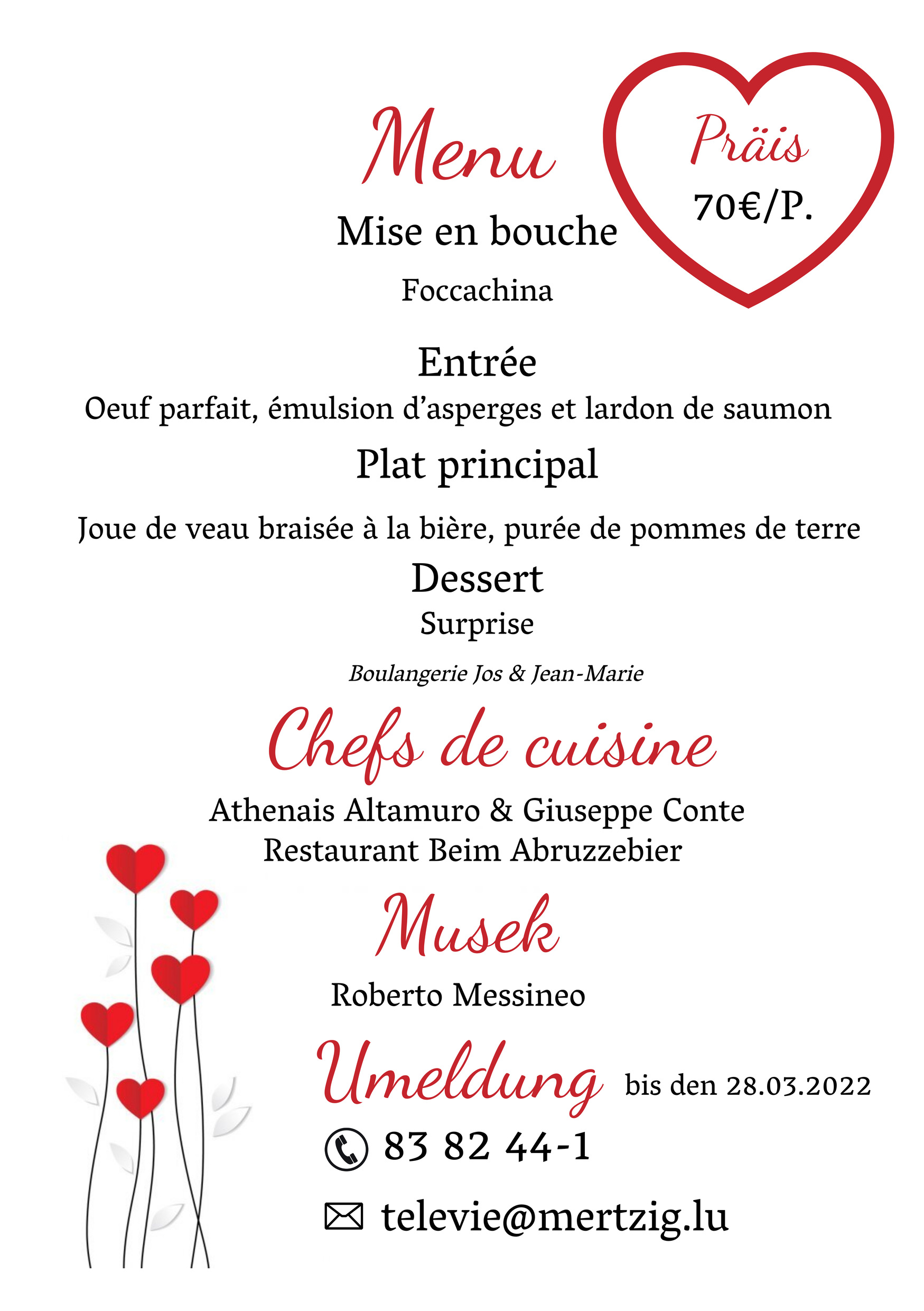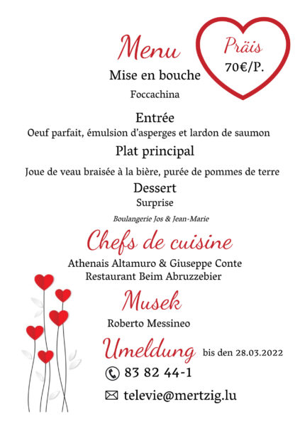 Umellen kënnt Dir Iech iwwer E-Mail un televie@mertzig.lu oder iwwer Telefon um 83 82 44 – 1. D’Plaze si limitéiert.