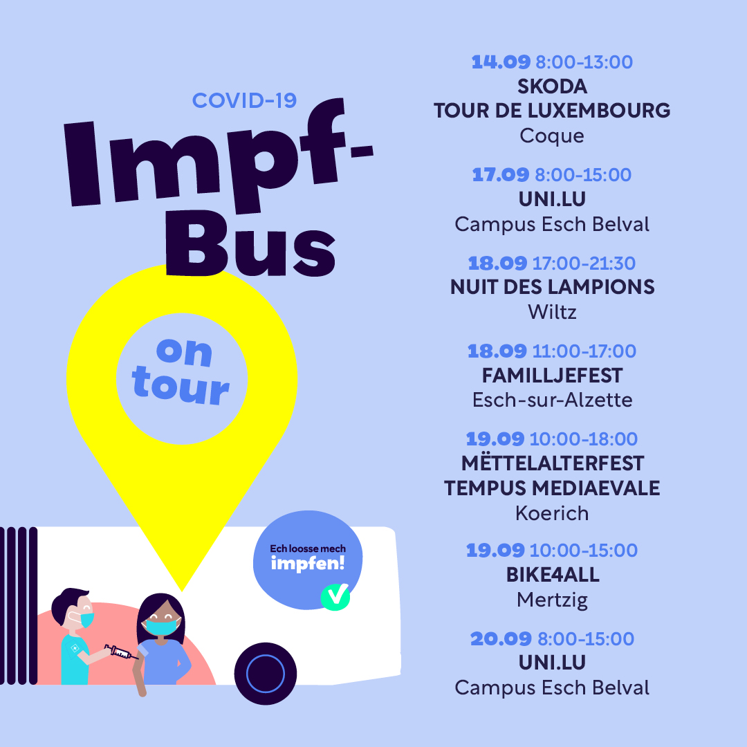 Den IMPFBUS ass e Sonndeg, den 19.09.2021 vun 10h00 – 15h00 virum « Centre Turelbaach » zu Mäerzeg.