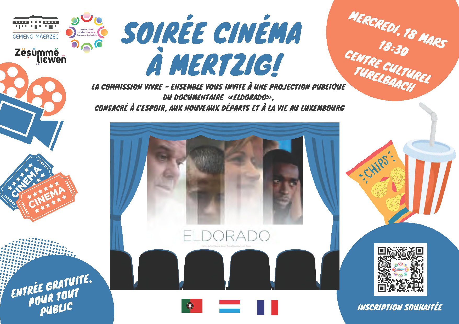 Centre Turelbaach 22 Rue Principale, Mertzig, LuxembourgLa Commission Vivre-Ensemble de la Commune de Mertzig vous invite à une projection publique du documentaire «Eldorado», consacré à l’espoir, aux nouveaux départs et à la vie au Luxembourg.