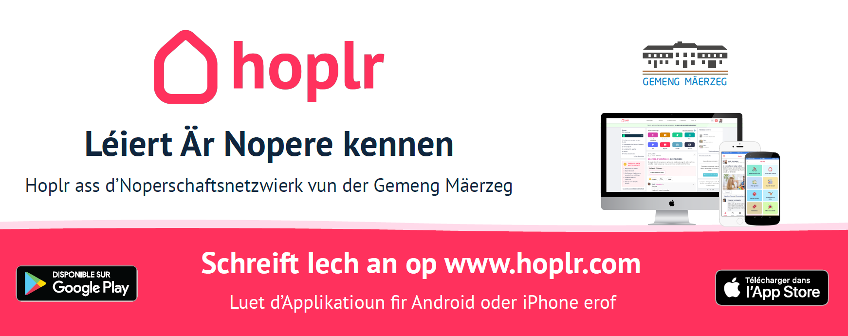 D’Gemeng Mäerzeg benotzt Hoplr, déi privat Websäit fir d’Noperschaft. Jiddereen, deen an der Gemeng wunnt, ka sech aschreiwen an op eng einfach Manéier mat senge Noperen a Kontakt kommen.