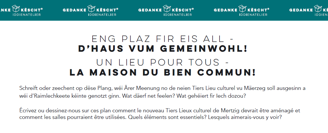 In diesem Zusammenhang und im Rahmen eines Besuchs mehrerer “Tiers-Lieux” im Süden des Landes am 16. Oktober 2021, darunter hervorzuheben das Projekt Facilitec in Esch/Alzette, hatte das Schöffenkollegium die Idee, in der Gemeinde Mertzig einen eigenen Tiers-Lieu zu gründen, das sich um die Werte der Gemeinwohl-Ökonomie dreht.