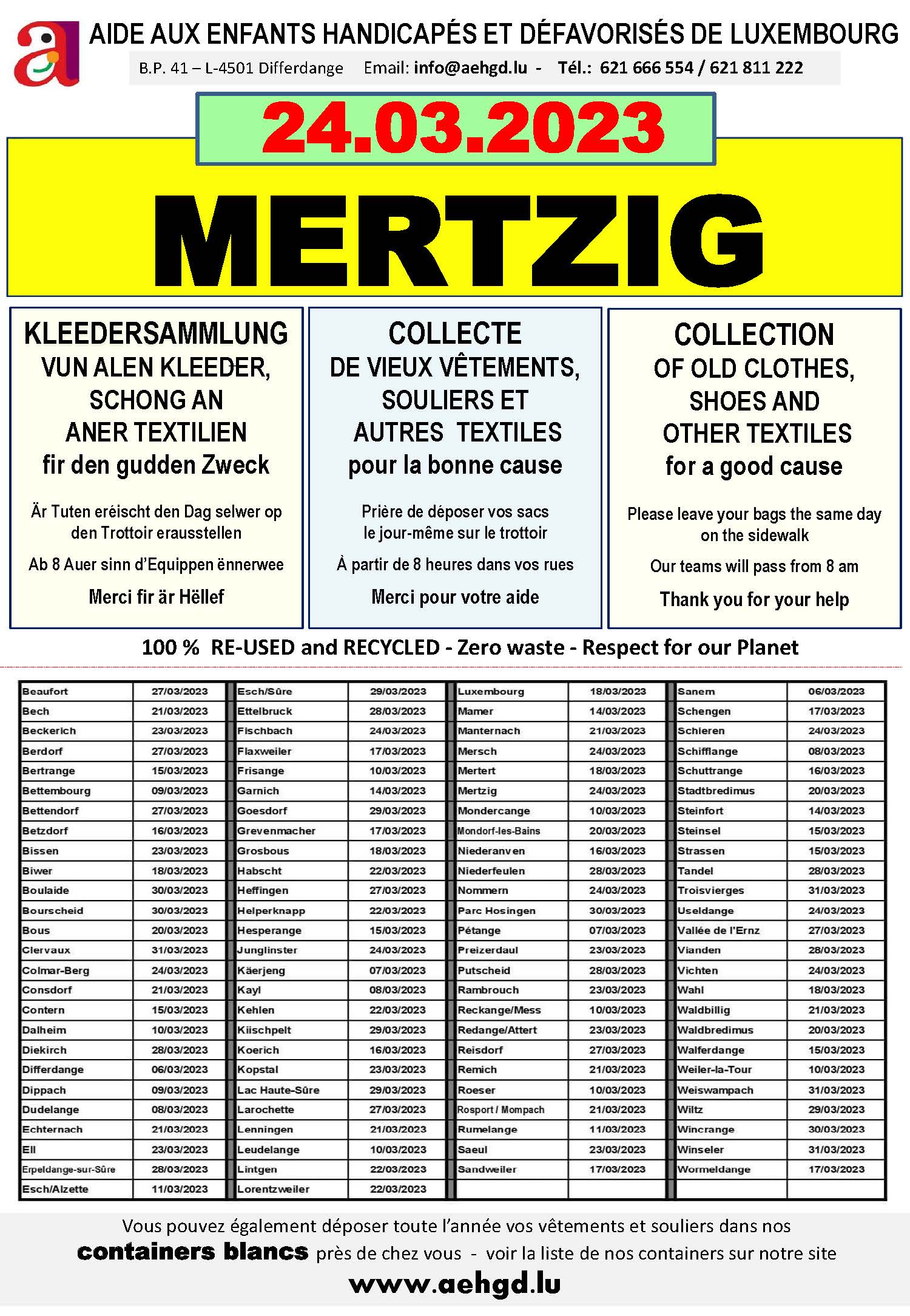 Kleedersammlung – AIDE AUX ENFANTS HANDICAPÉS ET DÉFAVORISÉS DE LUXEMBOURG 24/03/2023 @ 08:00 Mertzig, Luxembourg